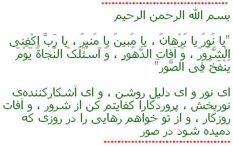 "یا نُورُ یا بُرْهانُ ، یا مُبینُ یا مُنیرُ ، یا رَبِّ اِکْفِنى الْشُّرُورَ ، وَ آفاتِ الدُّهُورِ ، وَ اَسْئَلُکَ النَّجاةَ یَوْمَ یُنْفَخُ فِى الصُّور"