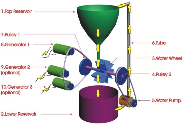 turn, spins an electrical alternator, powering both the pump and an electric light bulb, demonstrating free-energy
