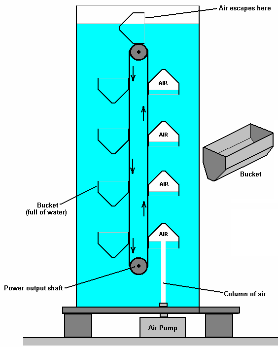 The rising air enters the lowest of the rising buckets and collects in it, forcing the water out of the open