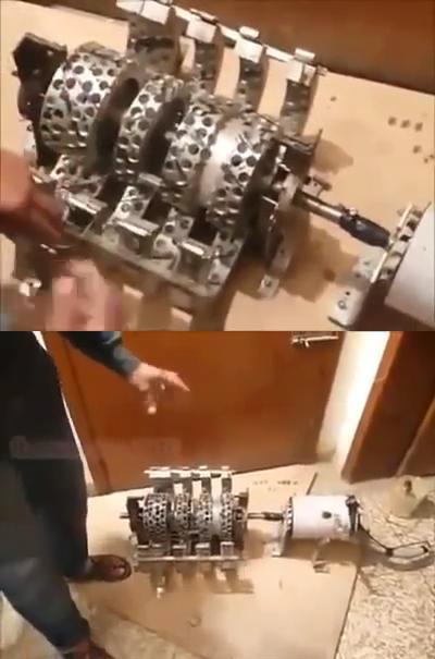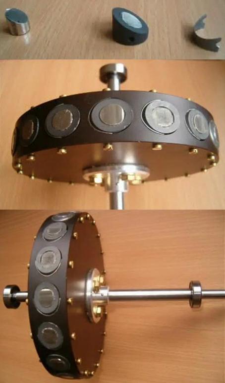 در تصویر زیر هم یک نمونه ی ساخته شده و به ژنراتور وصل شده هست که می بینید برای این که قدرت مناسب داشته باشه از ده ردیف استفاده کرده جالب اینجاست که از آهنرباهای ارزان قیمت استفاده کرده دقت کنید که بهتر هست هر حلقه و چرخ با فاصله کنار چرخ و حلقه ی دیگری باشده چون اینجوری خود آهنرباها اثرات هم رو کمتر خنثی می کنند
